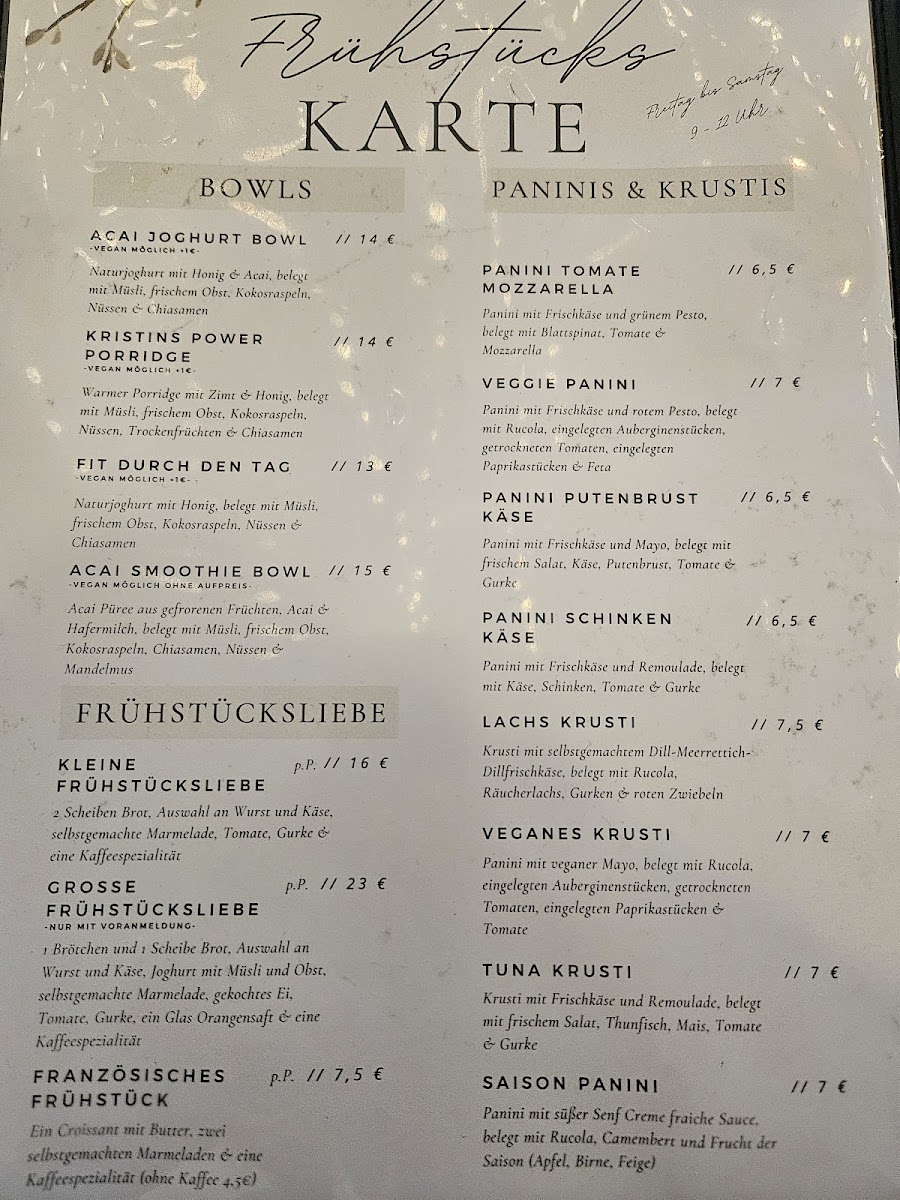 - Healthy Choices: The menu embraces healthy eating, featuring items like the Veggie Krusti and Avocadoliebe toast.